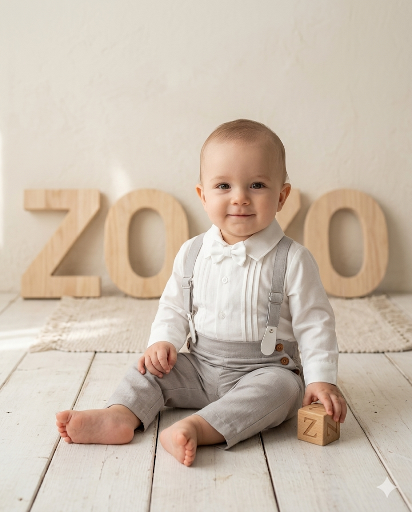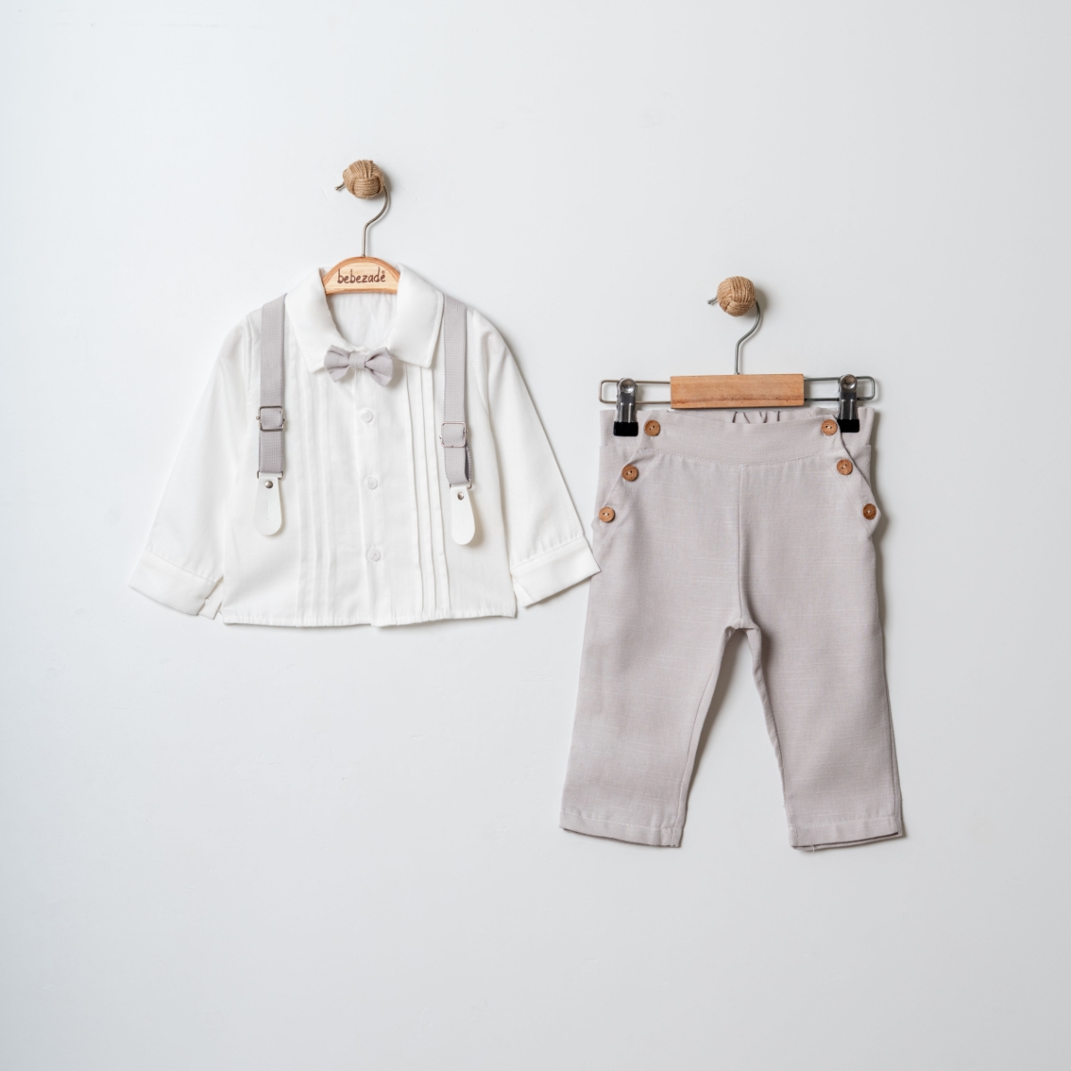 Ky kostum palicete per djem eshte zgjedhja perfekte per t’i dhuruar vogëlushit tuaj një pamje elegante dhe të adhurueshme në çdo rast të veçantë. Seti përfshin një këmishë të bardhë klasike, të shoqëruar me një papion elegant dhe pantallona gri komode që ofrojnë liri lëvizjeje për orë të tëra loje dhe argëtimi.