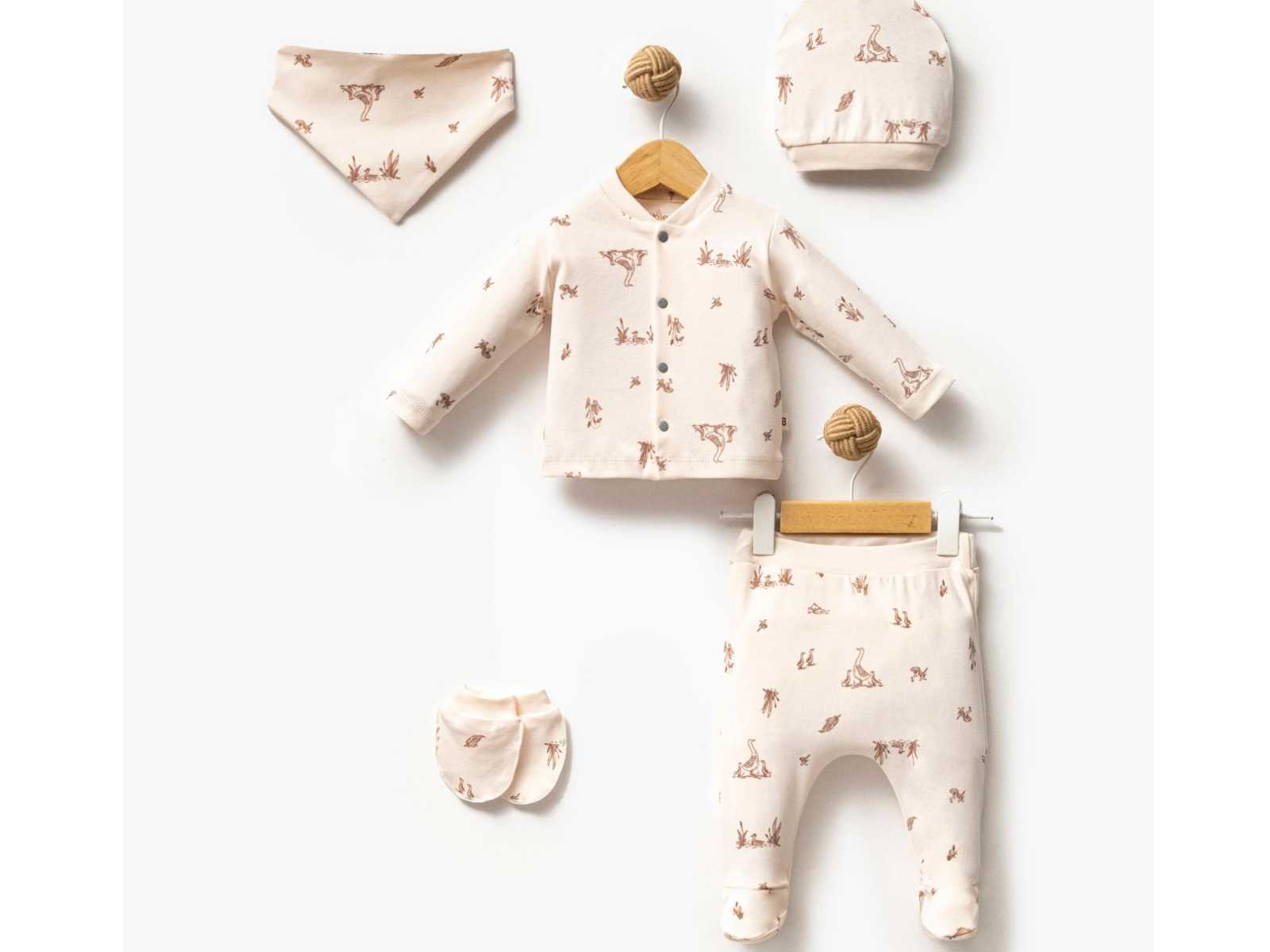 Zbuloni Setin e Maternitetit me 5 Pjesë Unisex, i përbërë nga pambuk organik 100%, i cili ofron butësi maksimale dhe është i butë me lëkurën delikate të bebes tuaj. Ky komplet është i dizajnuar për të porsalindurit, i përshtatshëm për bebet 0-3 muajsh, dhe është unisex, ideal si për djem ashtu edhe për vajza. Me pesë pjesë thelbësore, ai siguron rehati dhe praktikitet për ditët e para të jetës së foshnjës. Ngjyra bezhë neutrale dhe dizajni i tij e bëjnë këtë set të përshtatshëm për të gjitha stinët. Një ide dhurate perfekte dhe e dobishme për pritjen e ëmbël të një anëtari të ri në familje.