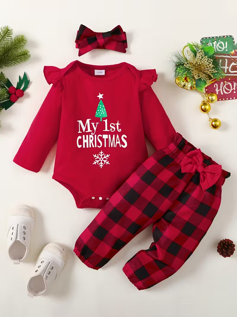 Set me 3 pjese festiv My First Christmas me body pantallone me fjongo dhe kordele kuqe